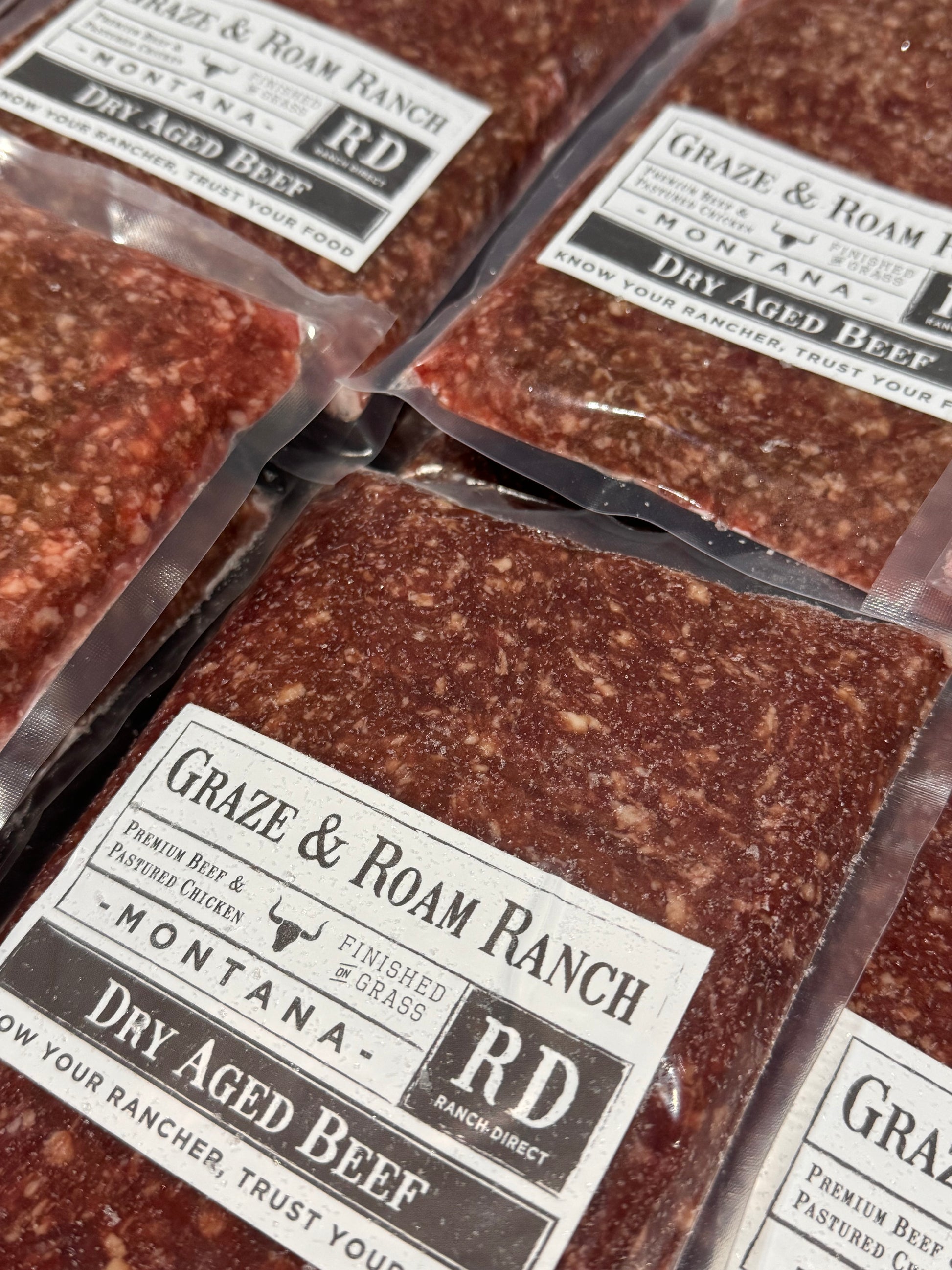 Raised here at our ranch in Montana, we can guarantee that there are never any added hormones or antibiotics, and that all of our animals are treated humanely and given space to graze and roam.