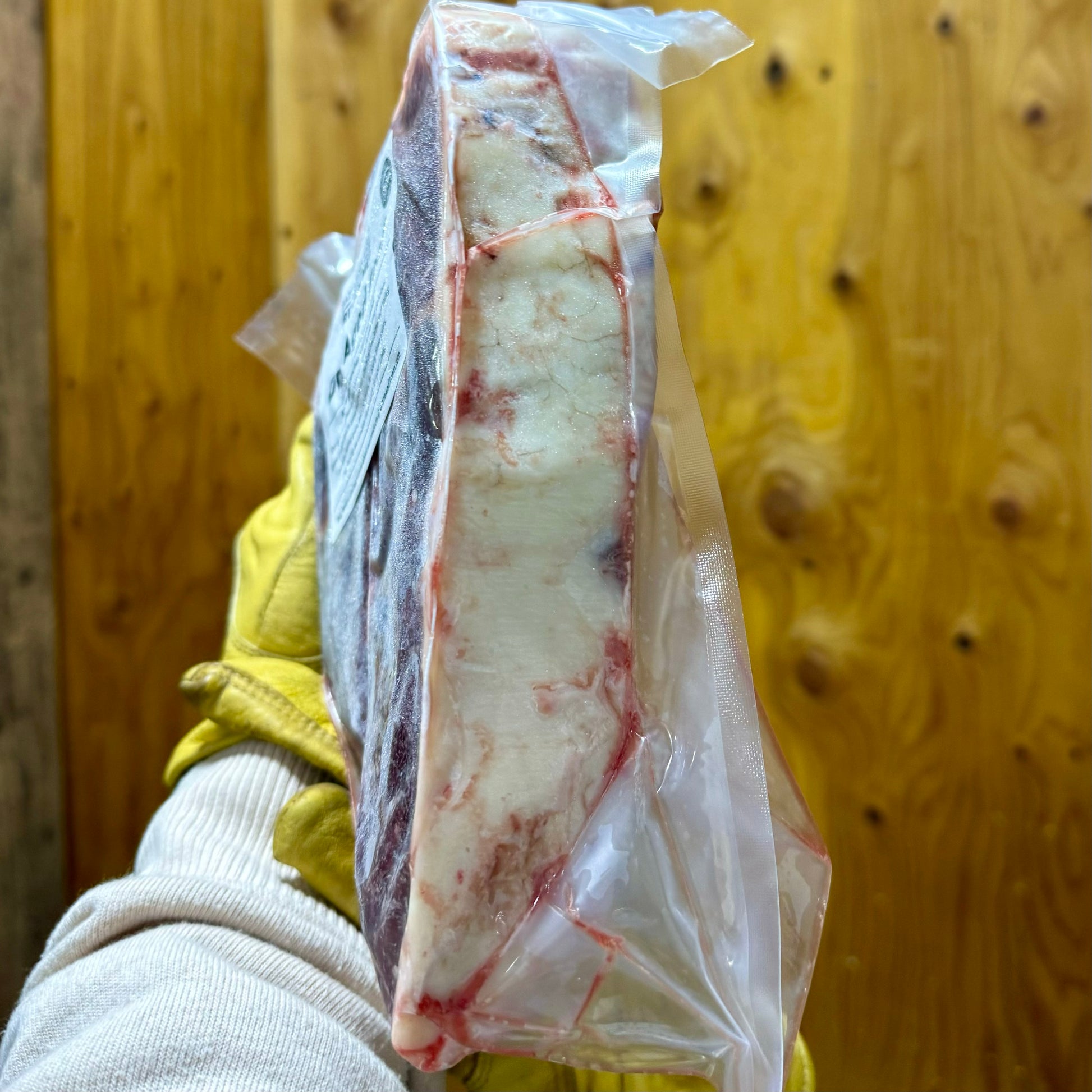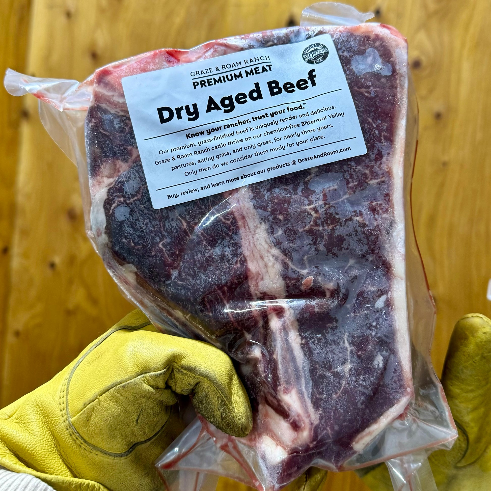 Did you know the Porterhouse (aka "The King" of steaks) is two steaks in one? The larger half is a New York Strip Steak, and the smaller side is a Tenderloin Steak (Filet Mignon). Because they're so large, you'll get a double dose of 2 1/2+ years of grass-finished marbling and tons of 14-day dry-aged flavor. Enjoy!
